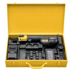 Sicherer Sitz der Presszange/Zwischenzange durch automatische Verriegelung. Für Akku- und Netzbetrieb. Elektronische Ladezustandskontrolle mit Tiefentladeschutz und Ladezustandsanzeige mit 2-farbiger LED.