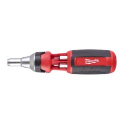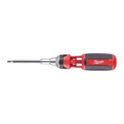 - Ergonomischer 152 mm langer Schraubendreher mit ¼″ Hex Steckschlüssel (in Aufnahme) und integriertem Entmantelungsmesser.